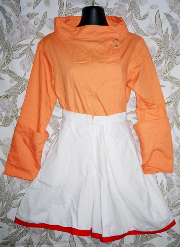 スタイル:オレンジの上着◇白のキュロットスカート◇ オレンジのハイソックス◇濃ピンクのリボン ◇ オレンジのスニーカー